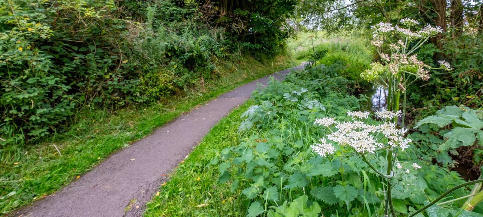 Cecilly-Brook-NR-PLGM-F24_9572r1 5th August 2024: Cecilly Brook Nature Reserve: Accessing the reserve from the rear of the leisure centre : Follow the path to join the surfaced path: © 2024...